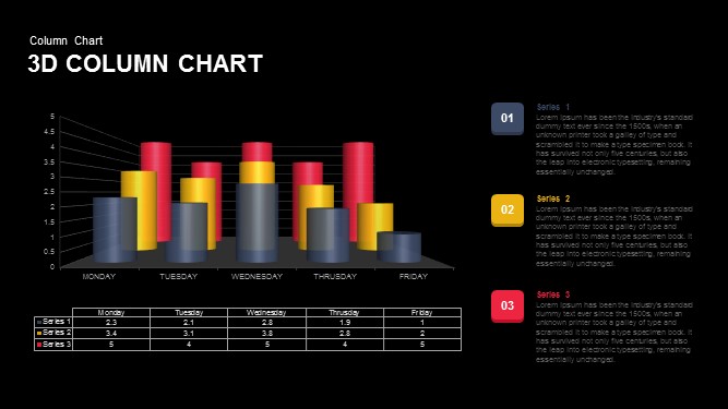 To do that we need to select the entire source range (range a4:e10 in the example), including the headings. Assume you have values of 50, 120 and 30 in three cells a1, a2 and a3 and a total of 200 in a4, all in sheet 1, and … The default setting is a clustered column. This beautiful 3d stacked column chart will help you to highlight achievements of team members.. This help page discusses the different chart types, including the distinctions between column in 3d charts and the true 3d column chart.
